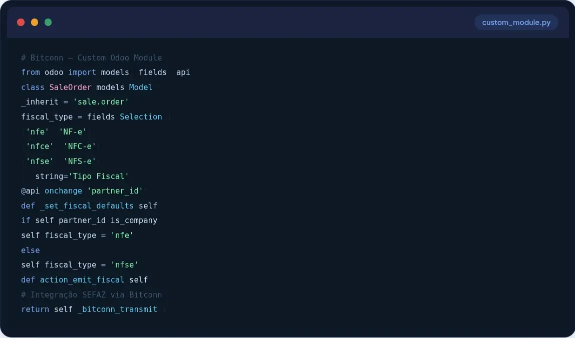 Desenvolvimento em Python + OWL do zero. Se o Odoo padrão não cobre, eu crio — integrado ao fluxo do seu negócio, sem gambiarras ou workarounds.